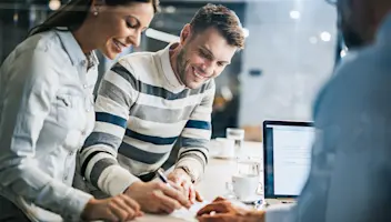Couple looking at a table from a financial advisor.