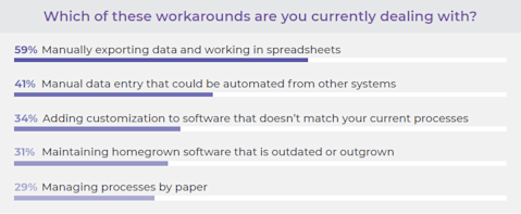 We asked our survey respondents to tell us what workarounds they are currently dealing with, and 75% told us that they were using spreadsheets or paper for tasks that could be easily automated. The problem with these manual processes is that they create errors. We also found that "dueling spreadsheets” are a very common issue that occurs when several people work from one file and version control becomes a problem.