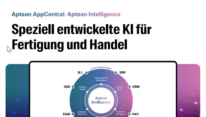 Datenblätter 22 Dez 2025Aptean Intelligence: KI für Fertigung und VertriebStärken Sie Ihre Teams mit Aptean AppCentral Intelligence – vereinen Sie Daten, Erkenntnisse und Automatisierung, um intelligentere und schnellere Geschäftsentscheidungen zu treffen.Herunterladen