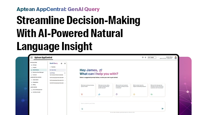 Datasheet 31 Oct 2025Aptean Intelligence: GenAI Query for Natural Language InsightsUnlock the power of Aptean Intelligence GenAI Query — transforming data into instant insights with smart, conversational AI for faster decisions.Download