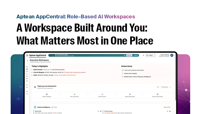 Datasheet Oct 31, 2025Aptean Intelligence: Role-Based WorkspacesDiscover how Aptean Intelligent Workflows in AppCentral streamline operations, improve visibility and enhance decision-making across your business.Download