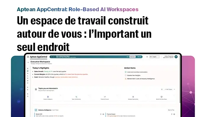 Datasheet 22 Déc 2025Aptean Intelligence : espaces de travail basés sur les rôlesDécouvrez comment les flux de travail intelligents Aptean dans AppCentral rationalisent les opérations, améliorent la visibilité et optimisent la prise de décision dans toute votre entreprise.Télécharger