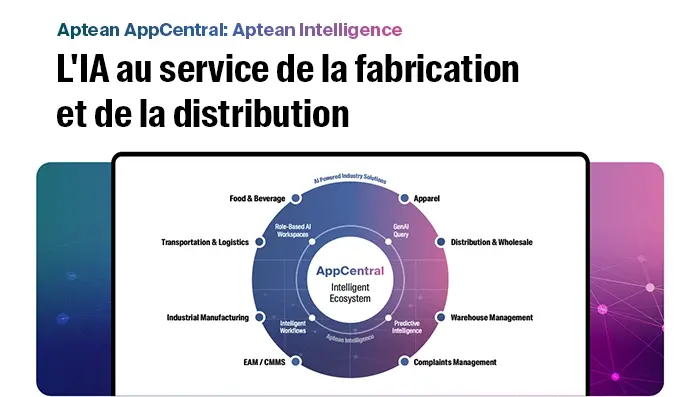 Datasheet 22 Déc 2025Aptean Intelligence : l'IA au service de la fabrication et de la distributionDonnez plus de moyens à vos équipes grâce à Aptean AppCentral Intelligence, qui combine données, informations et automatisation pour prendre des décisions commerciales plus intelligentes et plus rapides.Télécharger