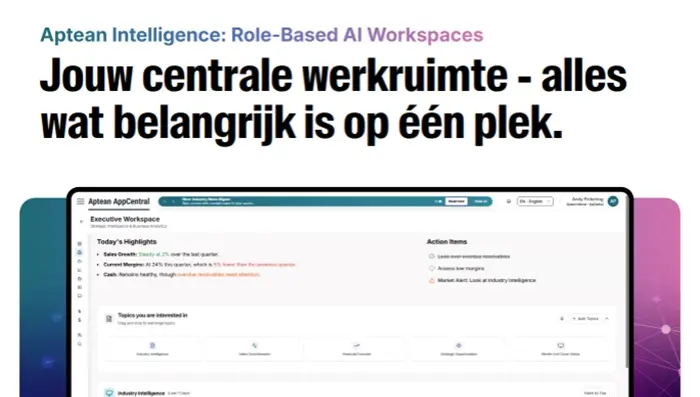 Datasheet 22 Dec 2025Aptean Intelligence: Op rollen gebaseerde werkruimtenOntdek hoe Aptean Intelligent Workflows in AppCentral uw bedrijfsvoering stroomlijnt, de zichtbaarheid verbetert en de besluitvorming binnen uw hele bedrijf verbetert.Downloaden